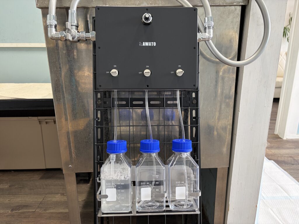 このたび当店では、シャンプーの品質をさらに高めるため、ナノバブルシャワー「NanoPet」と組み合わせて使用するシャンプーシステム「AWATO」を導入しました!